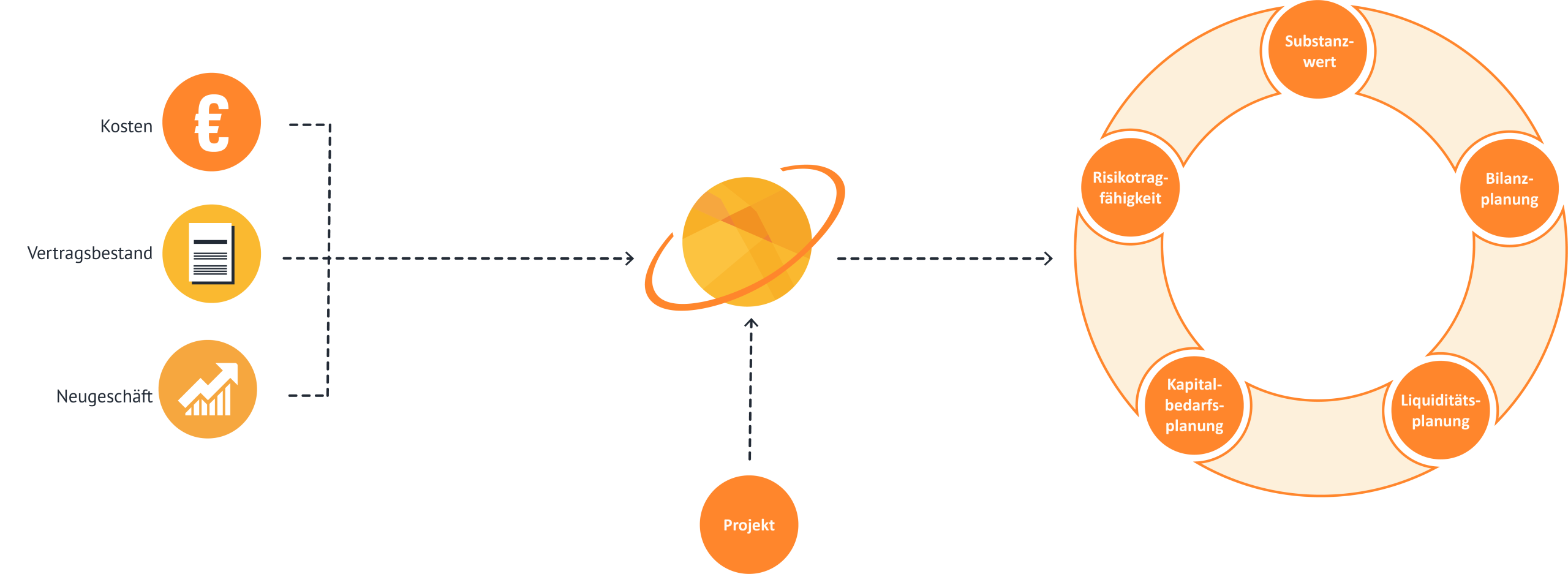 TRIGONIS führt Vertragsbestand, geplantes Neugeschäft und Kosten in einem Projekt zusammen und simuliert daraus die künftige Geschäftsentwicklung. Alle Eingaben werden zu einem konsistenten Rechenwerk verarbeitet, das Bilanz, GuV, Liquiditäts-, Kapitalbedarfs- und Risikotragfähigkeitsplanung sowie Substanzwert nahtlos miteinander verknüpft. Die Ergebnisse stehen als monatliche Zeitreihen bereit und ermöglichen fundierte Analysen, Szenarienvergleiche und revisionssichere Dokumentation. Darüber hinaus können durch Variation der Kostenstruktur, der Neugeschäftsannahmen und der Projektparameter unterschiedliche Szenarien modelliert werden. So wird Planung mit nur wenigen Klicks messbar, nachvollziehbar und regulatorisch belastbar.